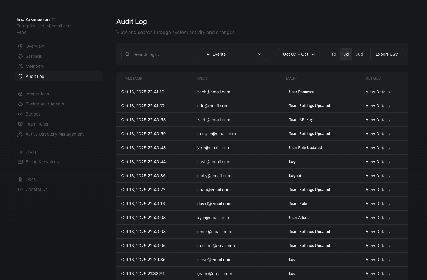 Audit Log data is available in the web dashboard and can be exported as a CSV.